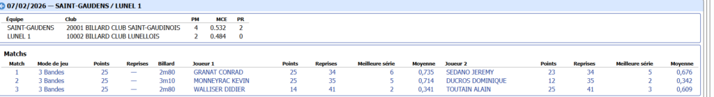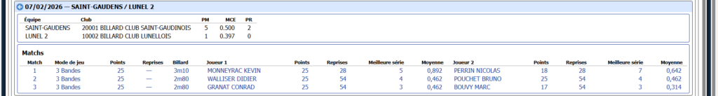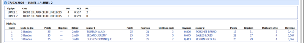 Dans le match très serré qui opposait les deux équipes de LUNEL , C’est LUNEL 1 ( SEDANO, TOUTAIN, DUCROS) qui sort vainqueur 2/1 face à l’équipe menée par son capitaine Nicolas PERRIN ( POUCHET, SALLES, BOUVY)