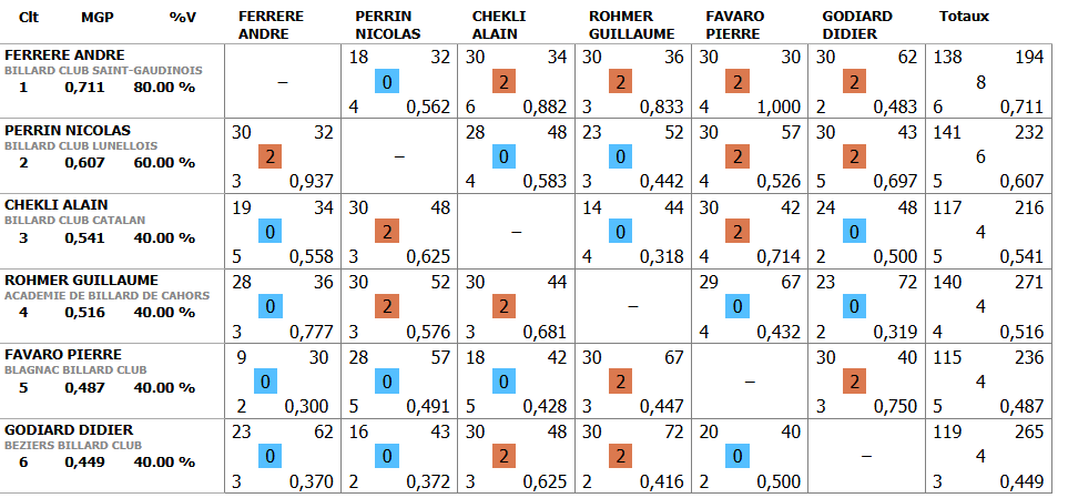 Avec 4 victoires en 5 rencontres , c’est le Saint Gaudinois ANDRE FERRERE qui devient le Champion de Ligue Occitanie au 3 bandes N2 ce week end à LUNEL.