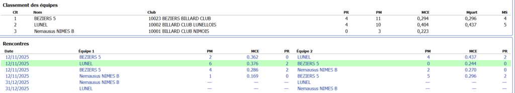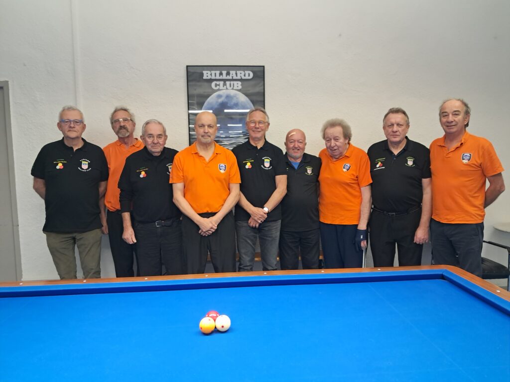 Mercredi 12 novembre 2025 , notre équipe de 3 BANDES F5 composée de Louis SALLES , Benoit HORNECKER ( Capitaine) Bruno POUCHET , Marc BOUVY recevait le matin l’équipe de BEZIERS pour son premier match de championnat fédéral 5 en match ALLER/RETOUR.