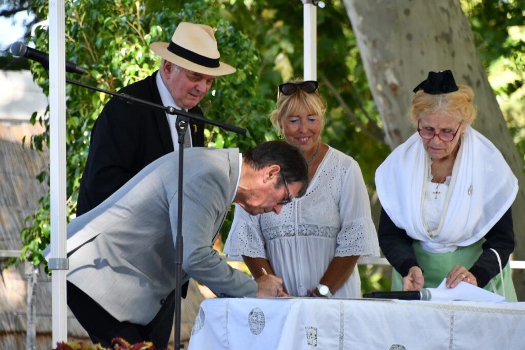Jeudi 17 juillet, à l’occasion de la belle journée du Terroir, au cœur de la Pescalune, la ville de Lunel était honorée par la remise du label « Ciéuta mistralenco » . Un passo-carriero, auquel prenaient part les charmantes Arlatenco, les musiciens, les élus de la ville, le Félibrige, l’école du Vidourle, le père Robert en queue de cortège, partait de l’église en direction du parc Jean Hugo pour le plaisir du public qui bordait les rues de la ville.