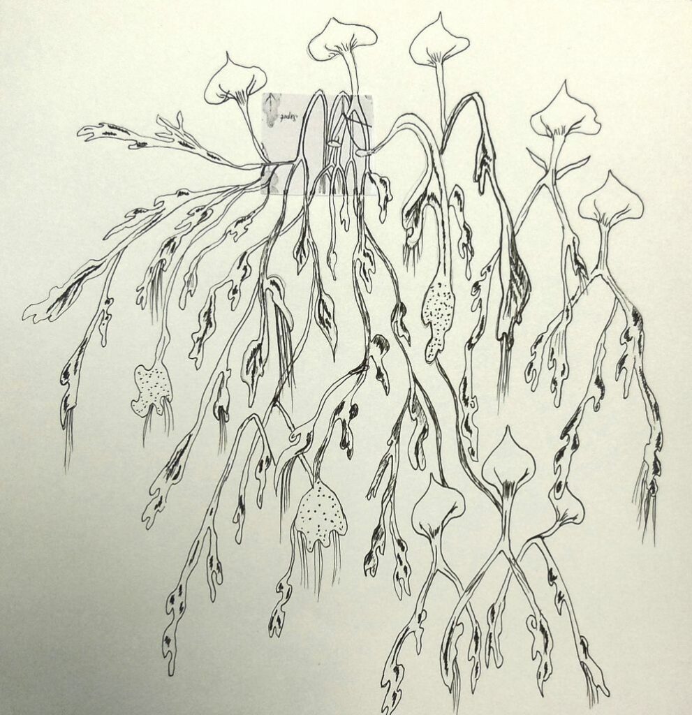 Chaque participante a débuté en sélectionnant un fragment d’un dessin de Francis Hallé, sans en connaître l’ensemble. Ce morceau isolé servait de point de départ, une invitation à imaginer et à prolonger l’univers arborescent selon sa propre sensibilité et son interprétation personnelle. Sans contrainte ni connaissance du dessin d’origine, chacune a laissé libre cours à son imagination, développant des ramifications, des entrelacs et des structures organiques inspirées par la nature.