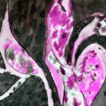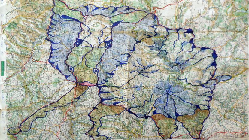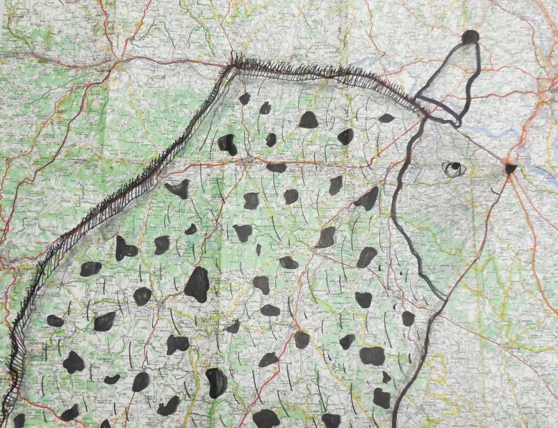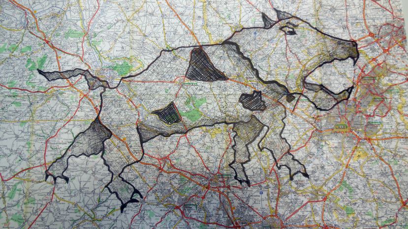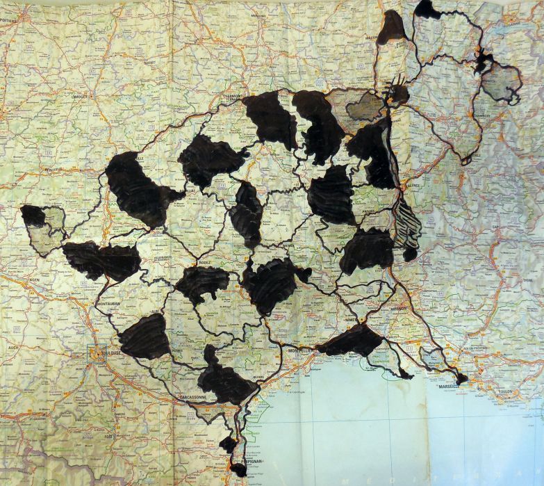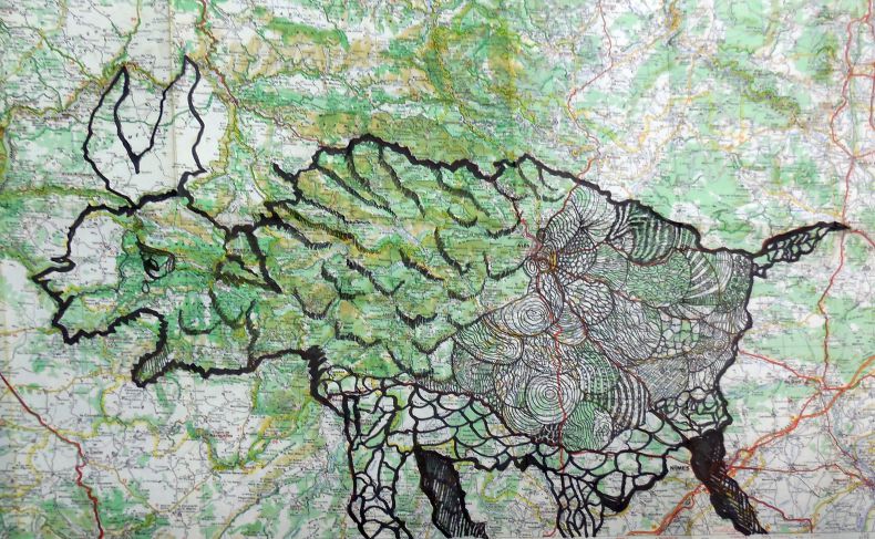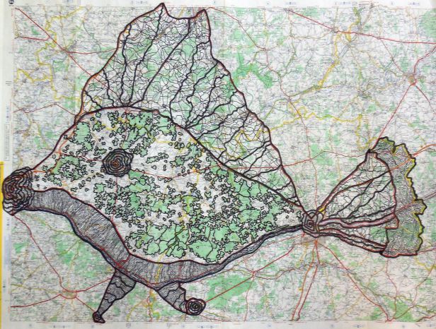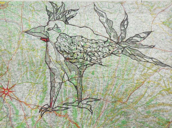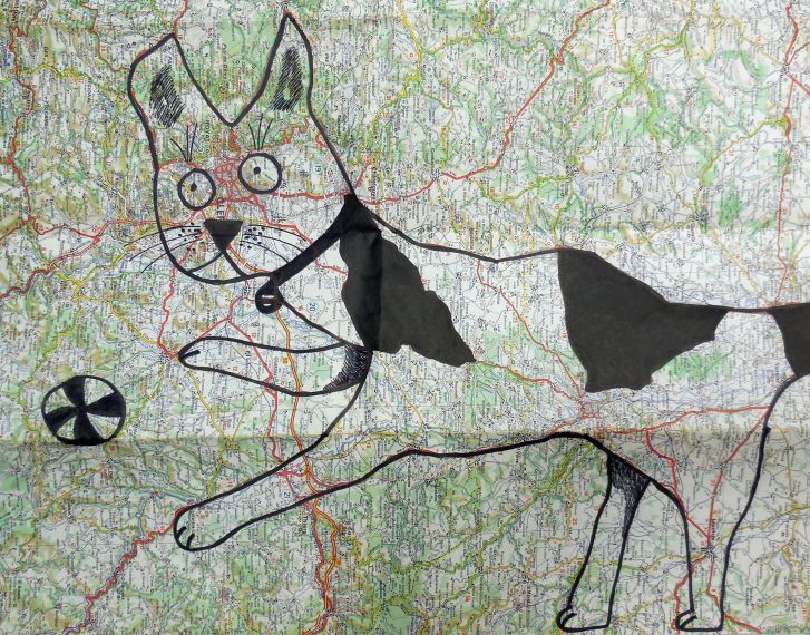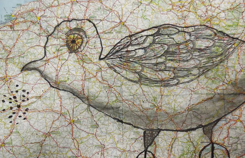 À mesure que les encres se mêlent aux routes et aux courbes de niveau, apparaissent des formes animales, des silhouettes hybrides nées du hasard des tracés. Quelques jeux d’ombres et de textures ajoutés à la main ou par frottage viennent renforcer les volumes, suggérer la matière, donner souffle à ces créatures de papier.